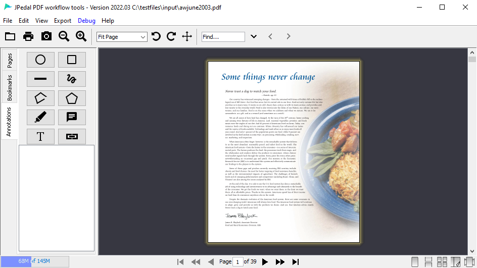さあ、いかがでしょうか?アイデア次第で、様々な業務フローシステムで利用できるかと思います。JPedalではこれらの画像の他にも円形、正方形、線、ポリゴン、テキスト、リンクなどがプログラムで実行でき、JPedalのGUIのビューアを使えば、加えてインク(手書き)、ポリライン(指定した点をつないで線を描く)、ハイライト、テキスト、フリーテキストなどのアノテーション(注釈)を追加できます。