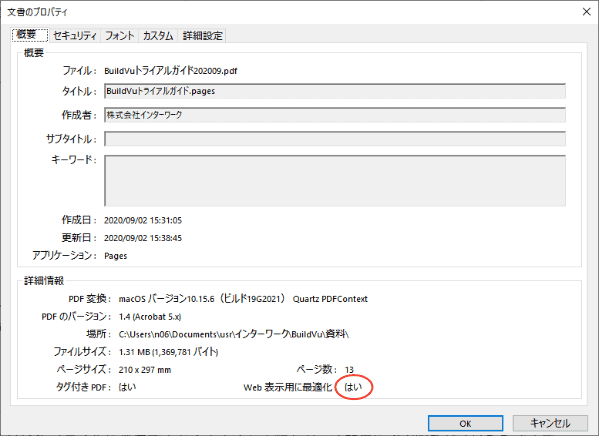 このPDFはリニアライズドPDFなのか、このアプリの出力はリニアライズドPDFなのかを見分けるのは簡単です。Windows PCでは、PDFをAdobe Acrobatで開き、「ファイル」→「プロパティ」で表示される「概要」欄を見てください。「Web表示用に最適化」という項目が「はい」ならリニアライズドPDFです。「いいえ」なら違います。