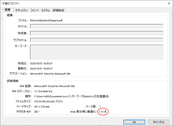 Windows 10でマイクロソフトWordから出力したPDFのプロパティです。Webページ用に最適化の欄は「いいえ」なので、リニアライズドPDFではありません。