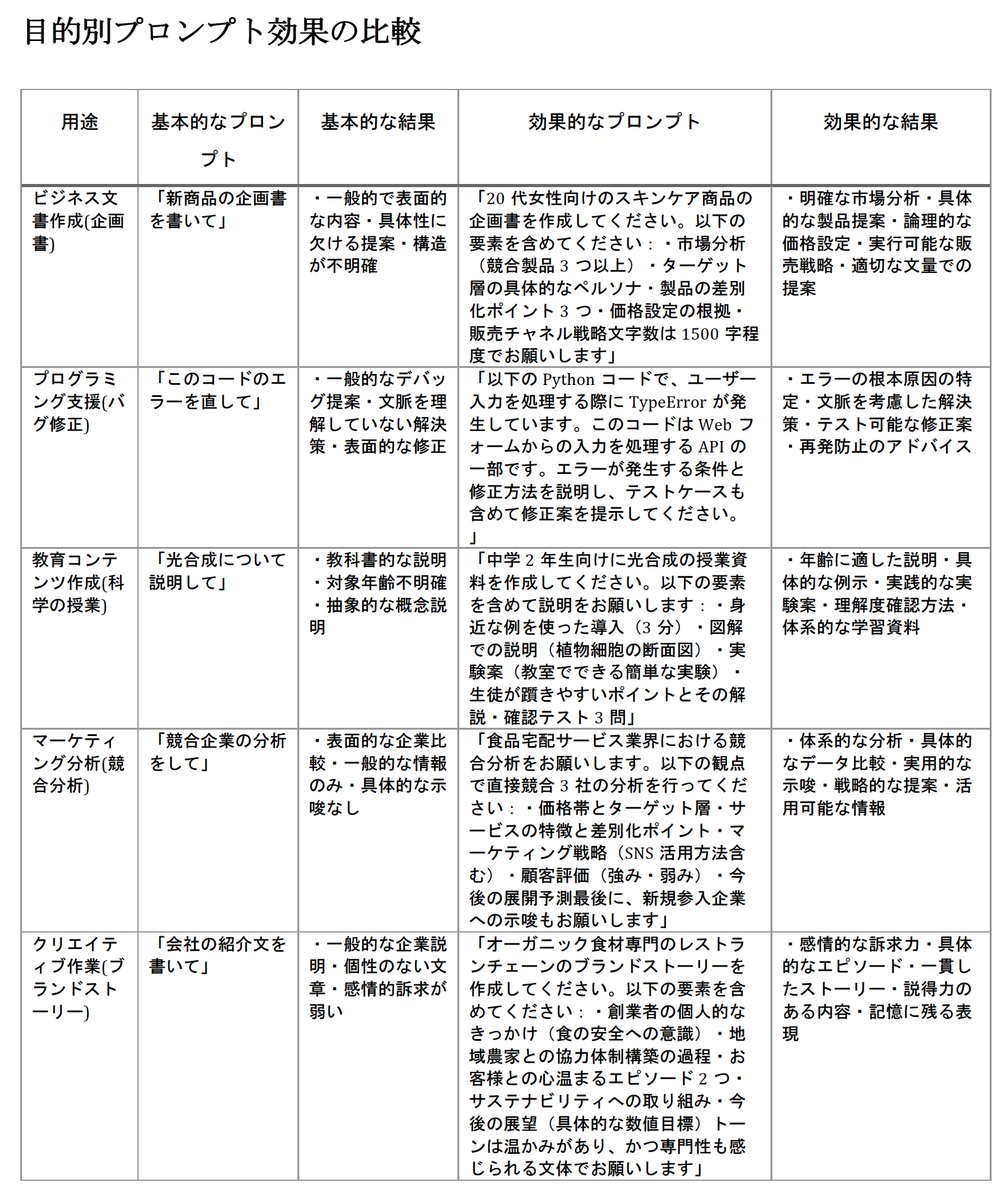 <h1>目的別プロンプト効果の比較</h1>
