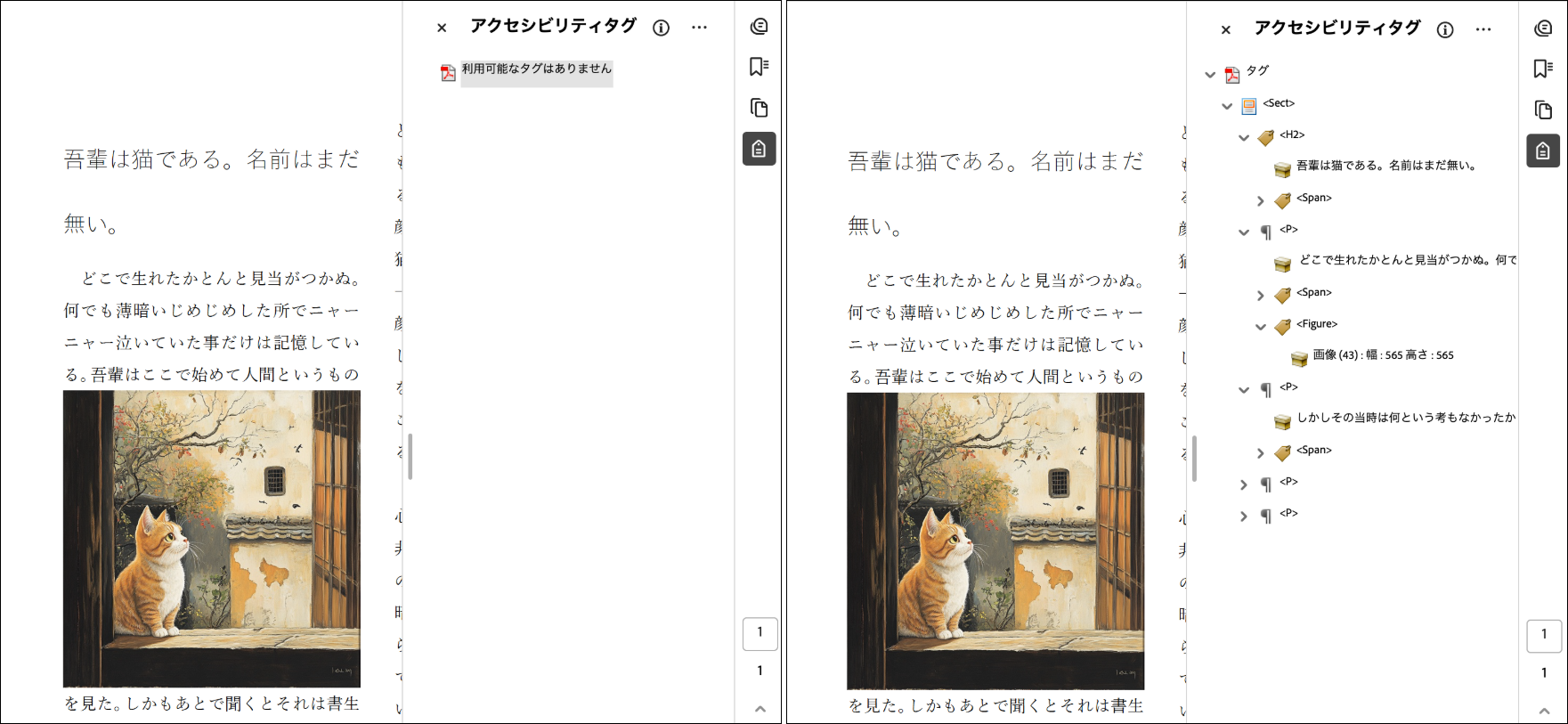タグなしPDFでは、冒頭のタイトルとして設定した「吾輩は猫である。名前はまだ無い。」や、イラストによって分断された文章を、一つのまとまった文章として認識できず、個別の文として読み上げました。一方、タグ付きPDFでは、タグによって文章のつながりが認識され、適切な読み上げが実現できました。今回のサンプルでは大きな違いは見られませんでしたが、タグ付きPDFはタグの上から下へと読み順が明確になるため、複雑なレイアウトの文書で特に効果を発揮すると考えられます。