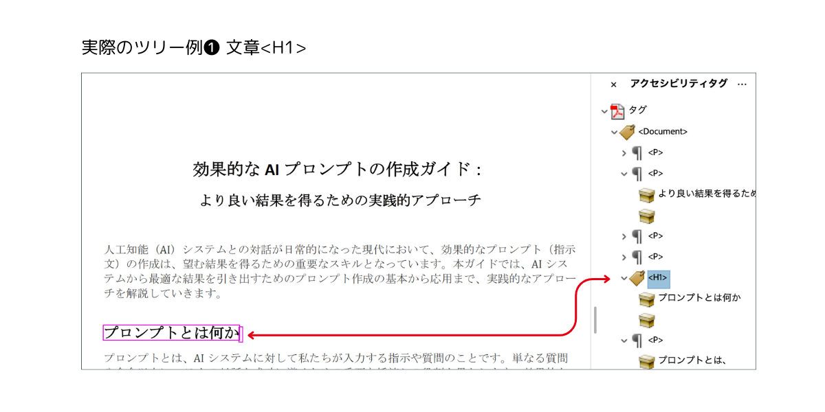 こちらはタグ付きPDFでのツリー表示で、<H1>の文書の表示です。