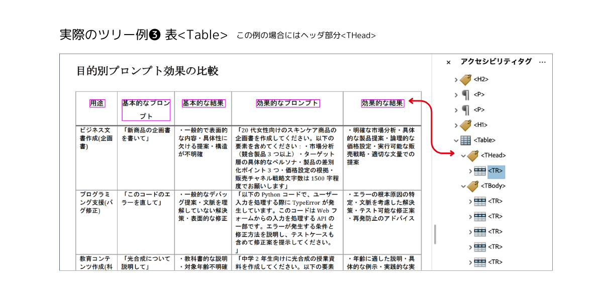 この2つの比較から分かるように、タグなしPDFは構造が明確でないため、情報の整理や理解が困難になることがあります。一方、タグ付きPDFでは、見出し、表、箇条書きなどが正確に認識され、情報が体系的に整理されています。